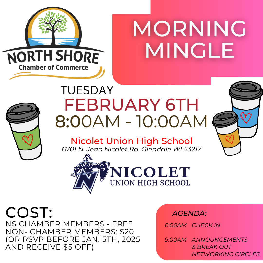 Join us for the February Morning Mingle! Hosted at Chamber member Nicolet Union High School! Let’s start your day off right…Come network, mingle & grab some delicious coffee and treats.