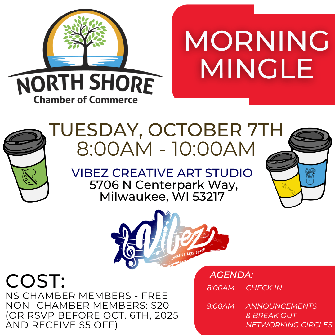 Join us for the October Morning Mingle! Hosted at Chamber member Vibez Creative Art Studio in Glendale. Let’s start your day off right…Come network, mingle & grab some delicious coffee and treats. Cost: NS CHAMBER MEMBERS – FREE NON- CHAMBER MEMBERS: $15 NON-CHAMBER MEMBERS (At the Door) $20